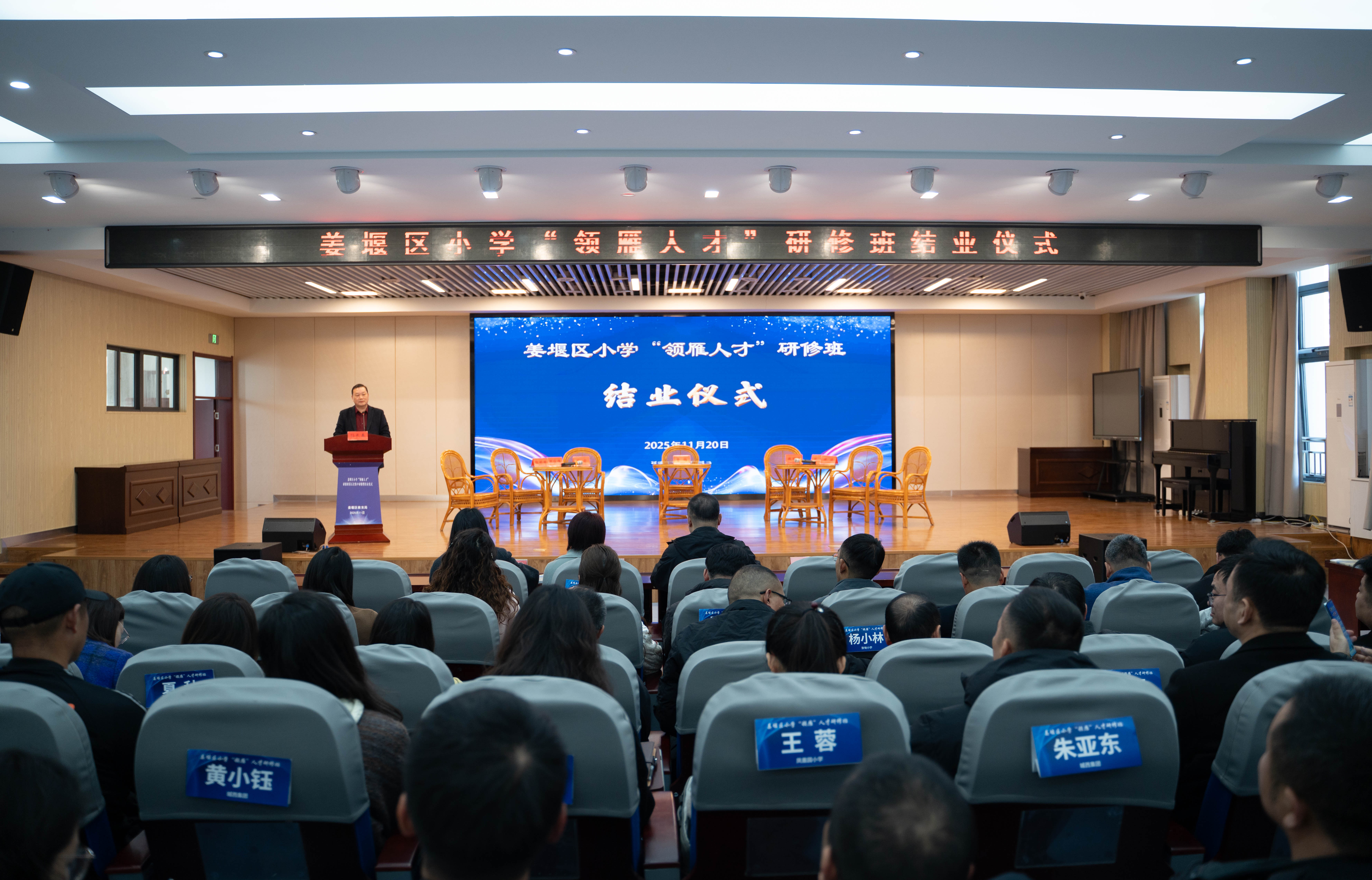 11月20日,姜堰区小学“领雁人才”研修班结业仪式在淮海小学举行,南京师范大学教育科学学院教授、博士生导师曹梅,全国中小学教师继续教育网副总经理宋姣,区委教育工委书记、区教育局局长申海峰,区委教育工委副书记、区教育局副局长孙长春,“领雁人才”研修班全体学员参加。