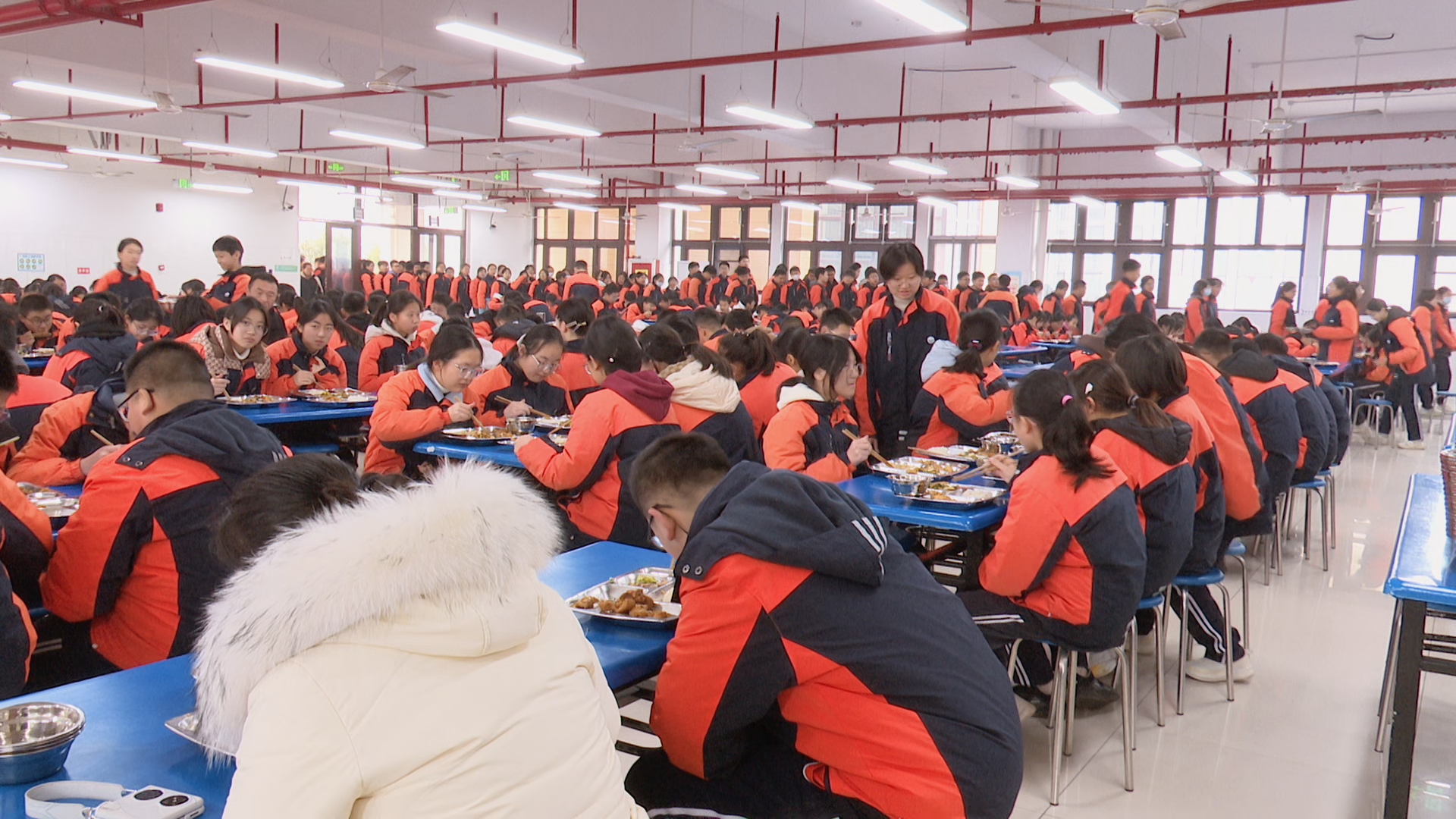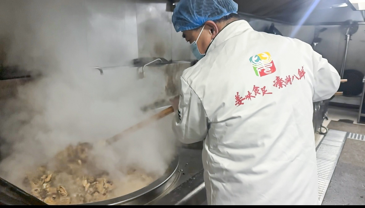 在城西学校教育集团三水初中校区食堂里,刘师傅、曹师傅早早开始备料。红烧小公鸡讲究肉质鲜嫩、入味均匀,两位大厨先将处理干净的鸡块焯水去腥,随后热锅凉油,下入姜片、葱段爆香。鸡块入锅后迅速翻炒至表面微黄,再加入料酒、酱油、冰糖等调味品,最后加汤转小火慢炖。随着锅内咕嘟声渐起,浓郁的酱香混合着鸡肉特有的鲜味弥漫开来。大厨介绍:“大锅菜要保证每块肉都入味,火候和时间的把控是关键。”炖煮过程中,两位大厨还不时与学校厨师交流如何保持鸡肉软嫩、汤汁醇厚的技巧。出锅后的红烧小公鸡色泽红亮,鸡肉酥软而不失嚼劲,汤汁浓郁适宜拌饭。午间就餐铃响起,食堂18个取餐窗口同步开放,学生们有序排队取餐,不少学生纷纷张望。“闻起来好香!”队伍中传来阵阵期待的声音。王思齐是首批取餐学生之一。她夹起一块鸡肉送入口中,眼睛随即亮了起来:“我觉得今天的小公鸡特别好,比我们平常在食堂里吃到的更让人有惊喜的感觉!”