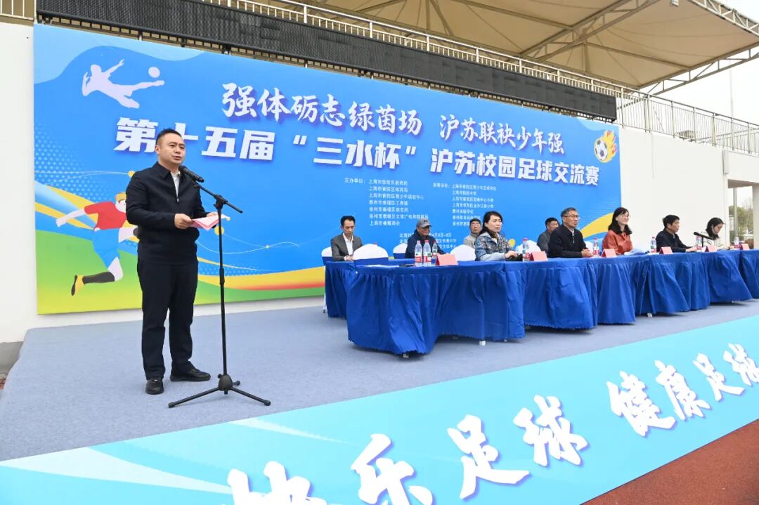 周正明在致辞中代表上海市姜堰商会,向关心支持商会发展的沪姜两地各级领导表示感谢,向参赛师生表示欢迎。他指出,商会始终发挥桥梁纽带作用,以“三水杯”沪苏校园足球交流赛为平台,推动两地教育、体育融合发展。本届参赛队伍已从姜堰扩展至泰州,品牌效应持续扩大。他表示,下一步,商会将继续拓展交流内涵、提升合作层次,为两地经济社会事业发展贡献更大力量。泰州姜堰是“苏超冠军城”,拥有深厚的文化底蕴和激扬的会船精神,他希望,同学们在绿茵场上充满激情、奋力拼搏,享受比赛,展示自我,用勤奋的汗水浇灌自己长大成才。