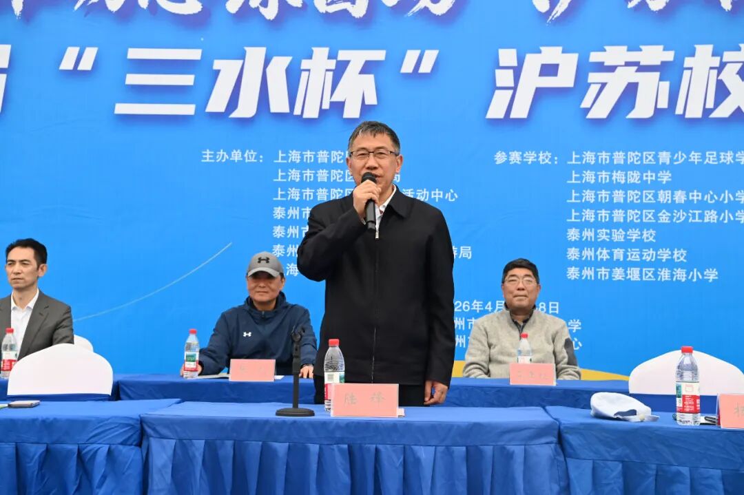 申海峰在致辞中表示,上午姜堰溱潼会船节刚刚圆满落幕,千帆竞发、百舸争流的热烈场面犹在眼前,那份“竞”的豪情与斗志,依然激荡在三水大地。借着这股“竞”的力量和精神,他对两地小球员提出三点希望:一是竞显本色、致敬热爱。小球员们舍弃休闲时光、奔赴绿茵赛场,为热爱而战、为团队而拼,这份对足球的执着、对竞技的坚守,正是少年成长中最珍贵、最难得的担当;二是竞逐球场、赛出风采。今天的赛场,是沪姜校园足球共建合作新十年的首场比拼,希望小球员们拿出不服输、争头名的会船精神,在绿茵场上尽情奔跑、全力以赴,赛出竞技水平、赛出团队默契、赛出少年意气;三是竞结友谊、收获成长。赛场之外,还有丰富的研学之旅,希望小球员们在赛场上是切磋技艺的对手,在场下是相知相惜的朋友,让沪姜情谊在三水之畔愈加深厚、愈加醇厚。